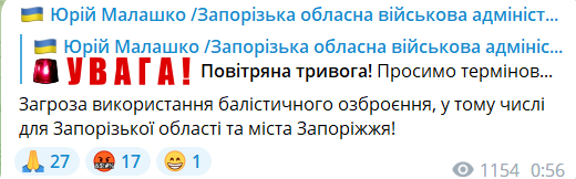 Своєю чергою очільник Запорізької ОВА Юрій Малашко повідомляє про загрозу використання балістичного озброєння для Запоріжжя.