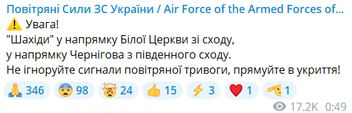 Оновлено 00:52. Повітряні сили повідомляють про рух напрямку БпЛА. Так, дрони летять у напрямку Білої Церкви, що на Київщині та Чернігова.