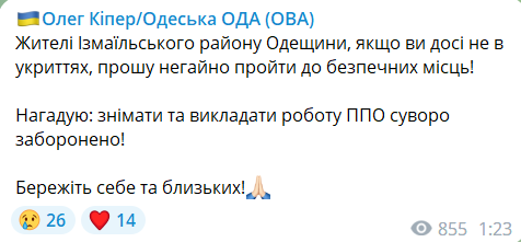 Оновлено 01:26. Закликають Ізмаїльський район пройти в укриття і в Одеській ОВА. Також там нагадують не знімати роботу українських захисників.