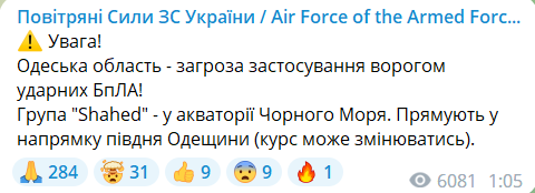 "Група Shahed — в акваторії Чорного Моря. Прямують у напрямку півдня Одещини (курс може змінюватись)", — додали українські захисники.