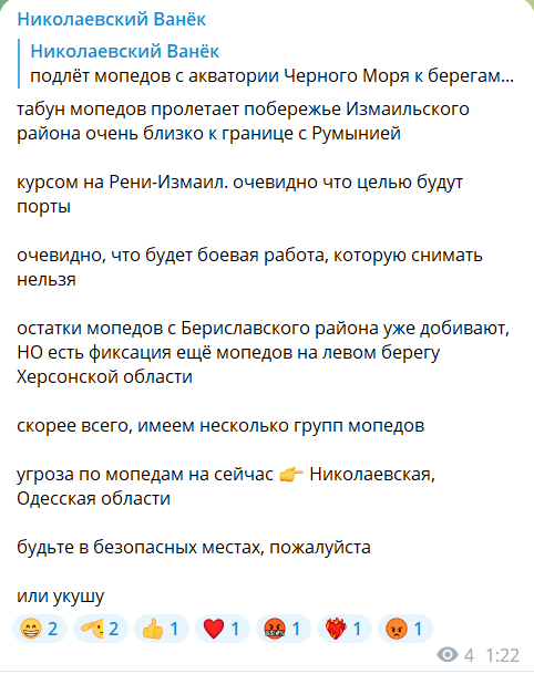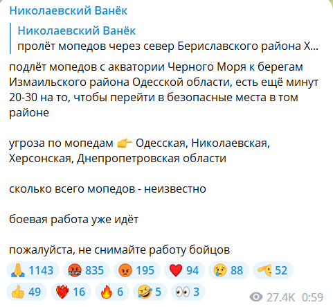 Оновлено 01:01. "Загроза по мопедах — Одеська, Миколаївська, Херсонська, Дніпропетровська області", — повідомляє моніторинговий канал "Николаевский Ванек".