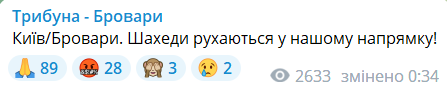 Оновлено 00:42. Деякі київські пабліки повідомляють про рух БпЛА в напрямку Броварів та Києва.