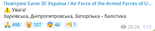 Оновлено 01:15. Повітряні сили повідомляють про загрозу балістичного озброєння для Харківської, Дніпропетровської та Запорізької областей.