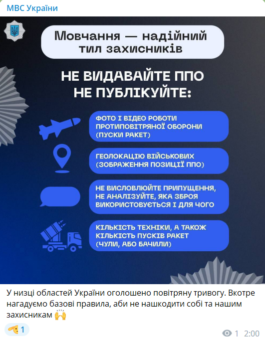 Оновлено 02:00. У МВС нагадують не знімати та не публікувати роботу засобів ППО, а також наводять низку інших правил.