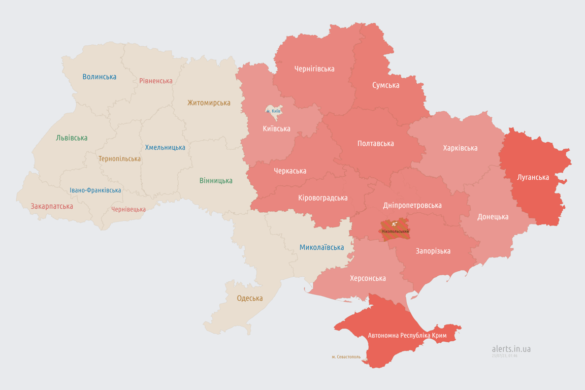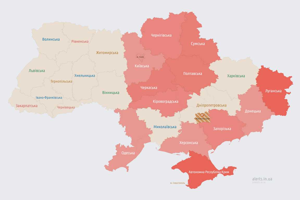 Повітряна тривога продовжує ширитися Україною. Так, вночі, 25 липня, "почервоніла" Київська та значна частина інших областей. На Сході є загроза балістики, а в інших регіонах — загроза БпЛА.