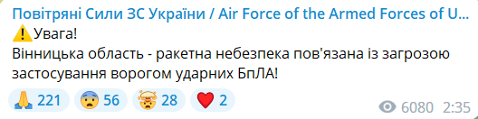 Оновлено 02:37. У Вінницькій області теж небезпека ворожої атаки, як попереджають Повітряні сили.