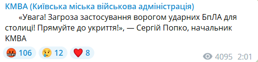 Оновлено 02:05. Є загроза застосування Росією ударних безпілотників для Києва, як повідомляє очільник КМВА Сергій Попко.