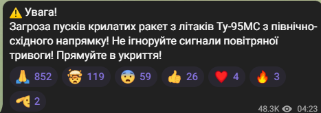 Повітряні сили України повідомляють, що є загроза пусків крилатих ракет з літаків Ту-95МС.