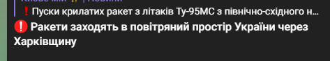 "Ракетна небезпека в областях, де оголошена тривога! Загроза пусків крилатих ракет з літаків Ту-95МС", — пишуть Повітряні Сили України.