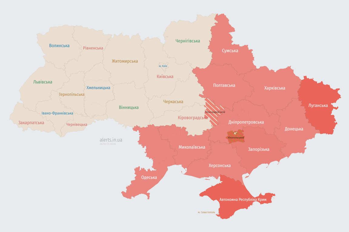 Повітряні сили попереджають, що крилаті ракети вночі, 6 серпня, входять до повітряного простору України. Наразі в більшості областей оголошено повітряну тривогу.