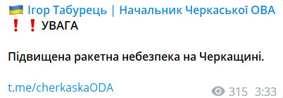 Також про підвищену небезпеку на Черкащині повідомляє очільник Черкаської ОВА Ігор Табурець.
