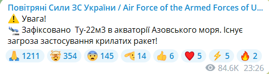 Оновлено 23:32. "Зафіксовано Ту-22м3 в акваторії Азовського моря. Існує загроза застосування крилатих ракет!" — повідомляють Повітряні сили.