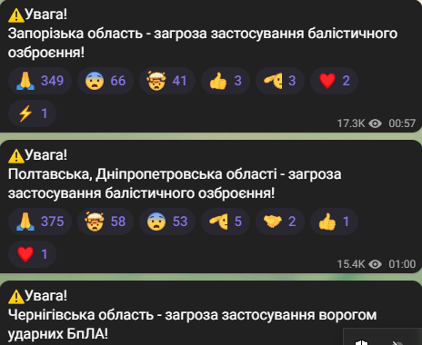- Запорізька, Полтавська, Дніпропетровська області — загроза застосування балістичного озброєння.