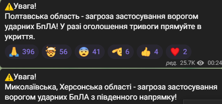 - Миколаївська, Херсонська, Полтавська — БпЛА з південного напрямку.