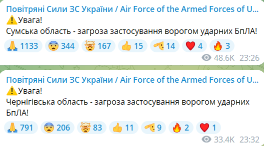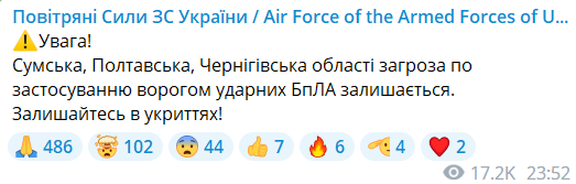 Оновлено 23:56. "Сумська, Полтавська, Чернігівська області загроза з застосування ворогом ударних БпЛА залишається. Залишайтесь в укриттях!", — повідомляють Повітряні сили.