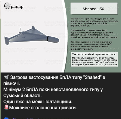 Повідомляється про загрозу атаки безпілотників у Полтавській та Сумській областях.