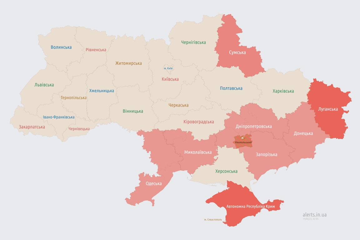 Вночі, 19 червня, в кількох областях України знову оголошено повітряну тривогу. Також попереджають про ракетну небезпеку.