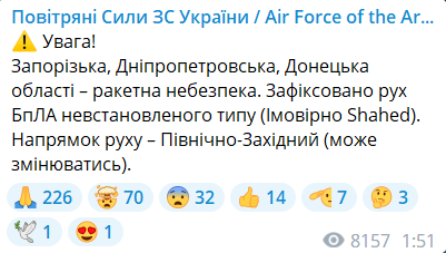 Оновлено 01:58. У Повітряних силах ЗСУ попереджають про ракетну небезпеку для Запорізької, Дніпропетровської та Донецької областей.