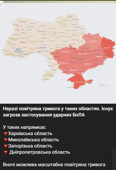 Повідомляється про загрозу застосування ворогом ударних дронів.