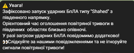 Повітряні сили України попереджають про запуск ворожих ударних безпілотників. За попередніми підрахунками, час оголошення повітряної тривоги очікується близько опівночі.