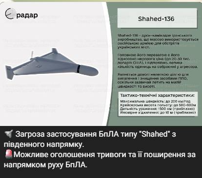 Повідомляється, що зафіксовано запуск ударних БпЛА типу Shahed з південного напрямку.