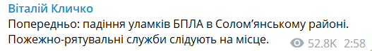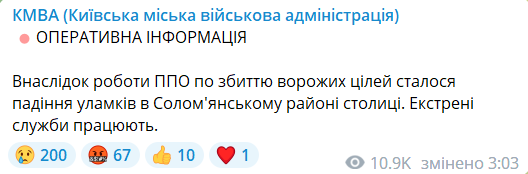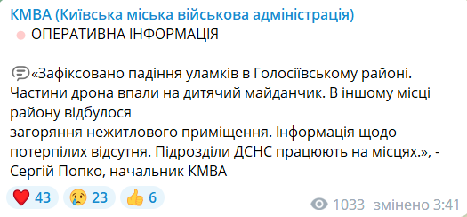 Оновлено 03:44. "Зафіксовано падіння уламків в Голосіївському районі. Частини дрона впали на дитячий майданчик. В іншому місці району відбулося загоряння нежитлового приміщення. Інформація щодо потерпілих відсутня. Підрозділи ДСНС працюють на місцях", — очільник КМВА Сергій Попко.