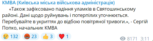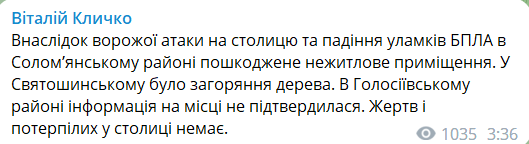 Оновлено 03:13. "У Солом’янському районі столиці є пошкодження нежитлового приміщення через падіння уламків, а у Святошинському — горить дерево", — повідомив міський голова Кличко.