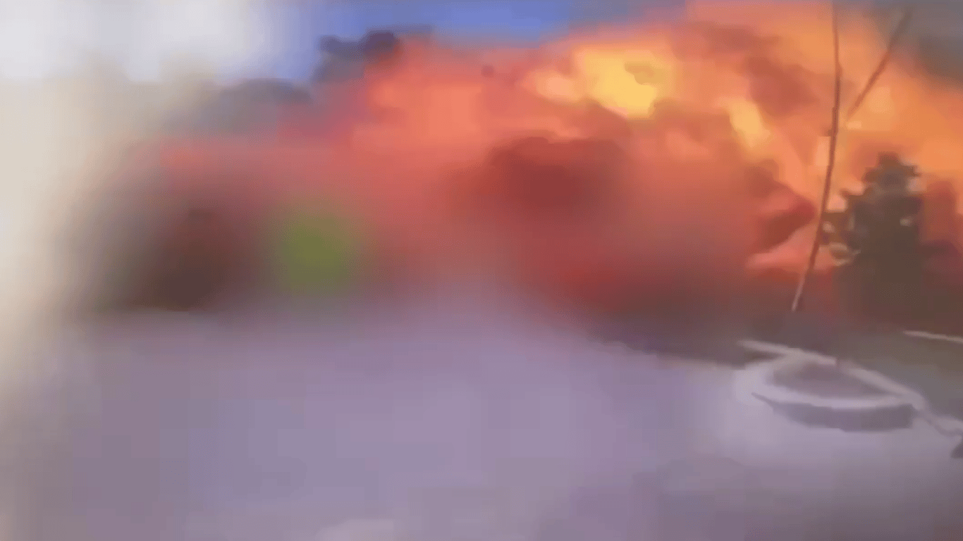 На вказаному відео видно, що машини спокійно їдуть вулицею і раптом проноситься хвиля вогню. Далі починається шлейф чорного диму.