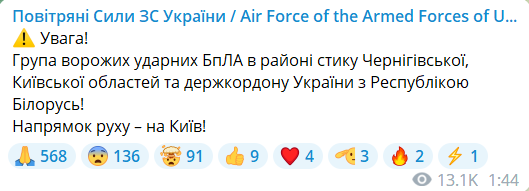 Оновлено 02:04. "Група ворожих ударних БпЛА рухаються у напрямку Чернігова!" — повідомляють Повітряні сили.