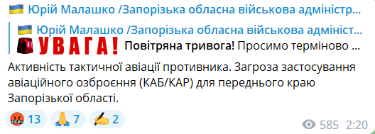Оновлено 02:25. "Активність тактичної авіації противника. Загроза застосування авіаційного озброєння (КАБ/КАР) для переднього краю Запорізької області", — повідомили в Запорізькій ОВА.
