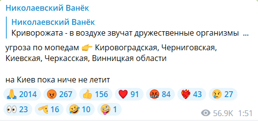 Оновлено 01:47. Повітряні сили попереджають про групу безпілотників, які рухаються на Київ. Також в Київській області оголошено повітряну тривогу.