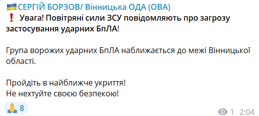 Оновлено 02:06. У Вінницькій ОВА повідомляють про групу ворожих ударних БпЛА, що рухається до Вінниччини.