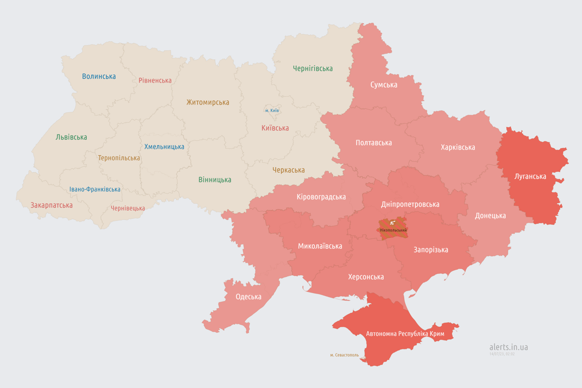 Нагадаємо, що ввечері, 13 липня, Україною почала ширитися повітряна тривога. Наразі "почервоніла" значна частина областей.