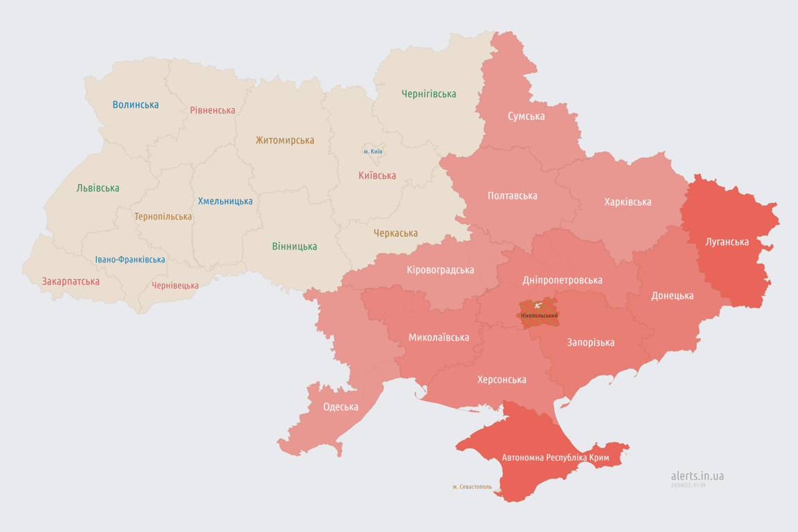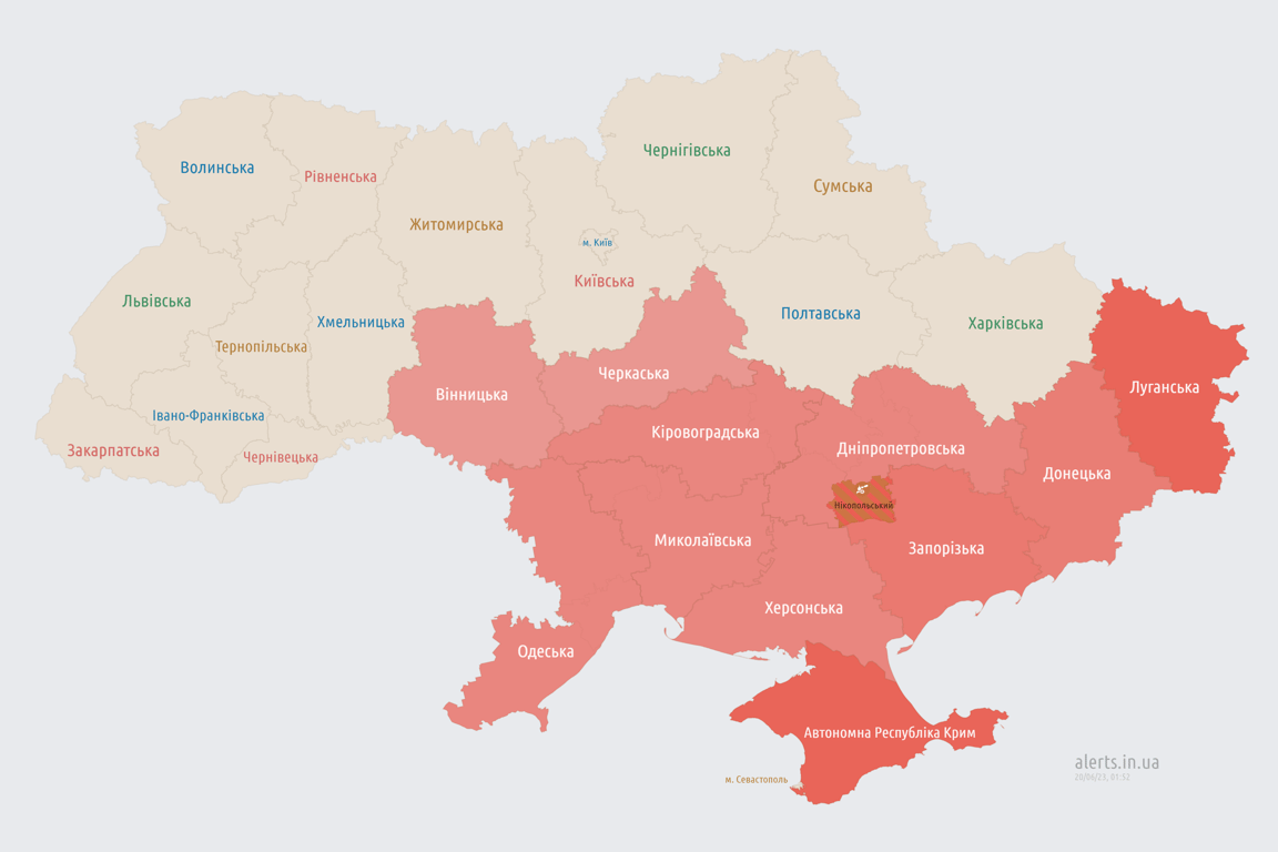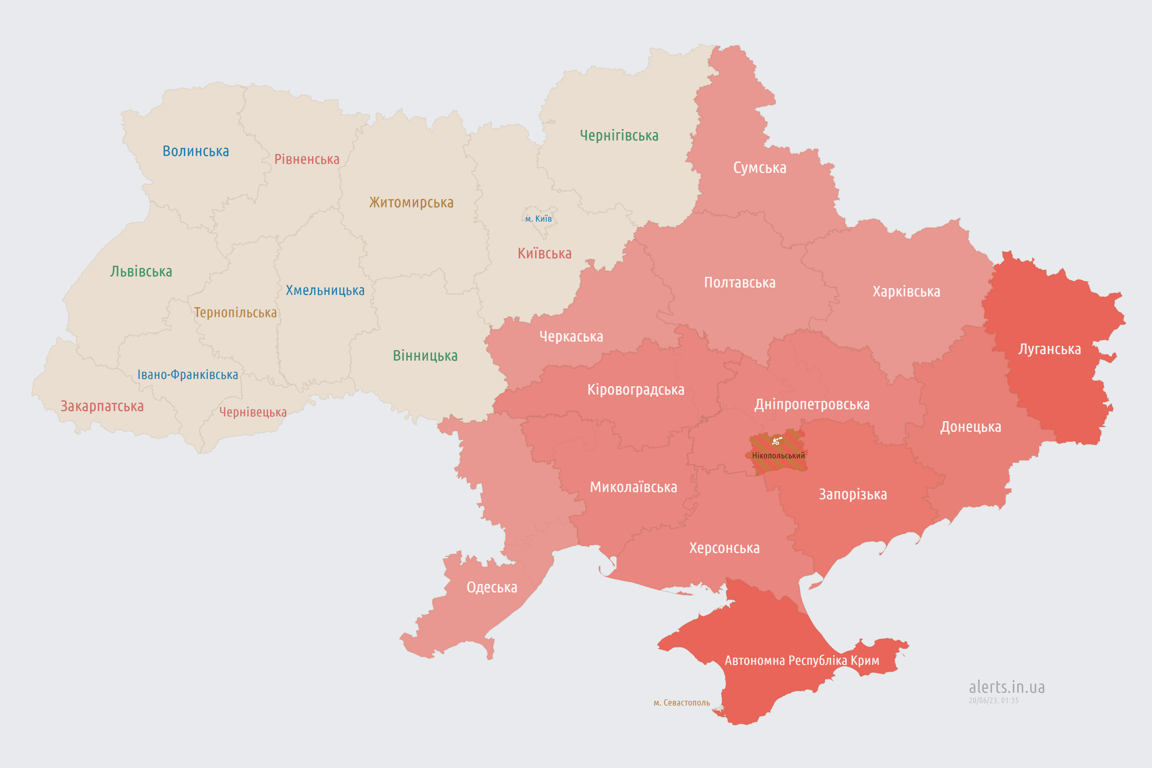 Оновлено 01:36. Наразі повітряна тривога охопила частину території України.
