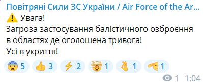 Також у Повітряних силах повідомляють про загрозу застосування балістичного озброєння.