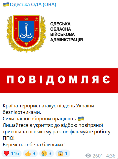 Оновлено 04:40. "Сили нашої оборони працюють. Лишайтеся в укриттях до відбою повітряної тривоги та ні в якому разі не фільмуйте роботу ППО!" — Одеська ОДА.
