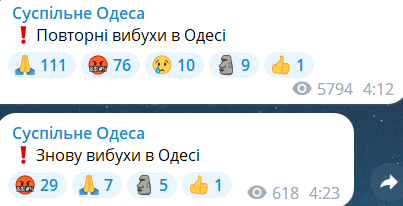 Оновлено 04:24. Суспільне повідомляє про ще одні вибухи в Одесі.