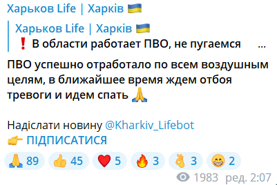 Оновлено 02:10. Також місцеві пабліки повідомляють про успішну роботу ППО.