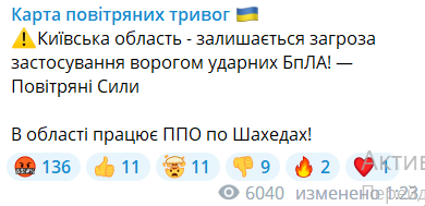 Оновлено 01:25. У Київській області — загроза застосування ударних безпілотників.