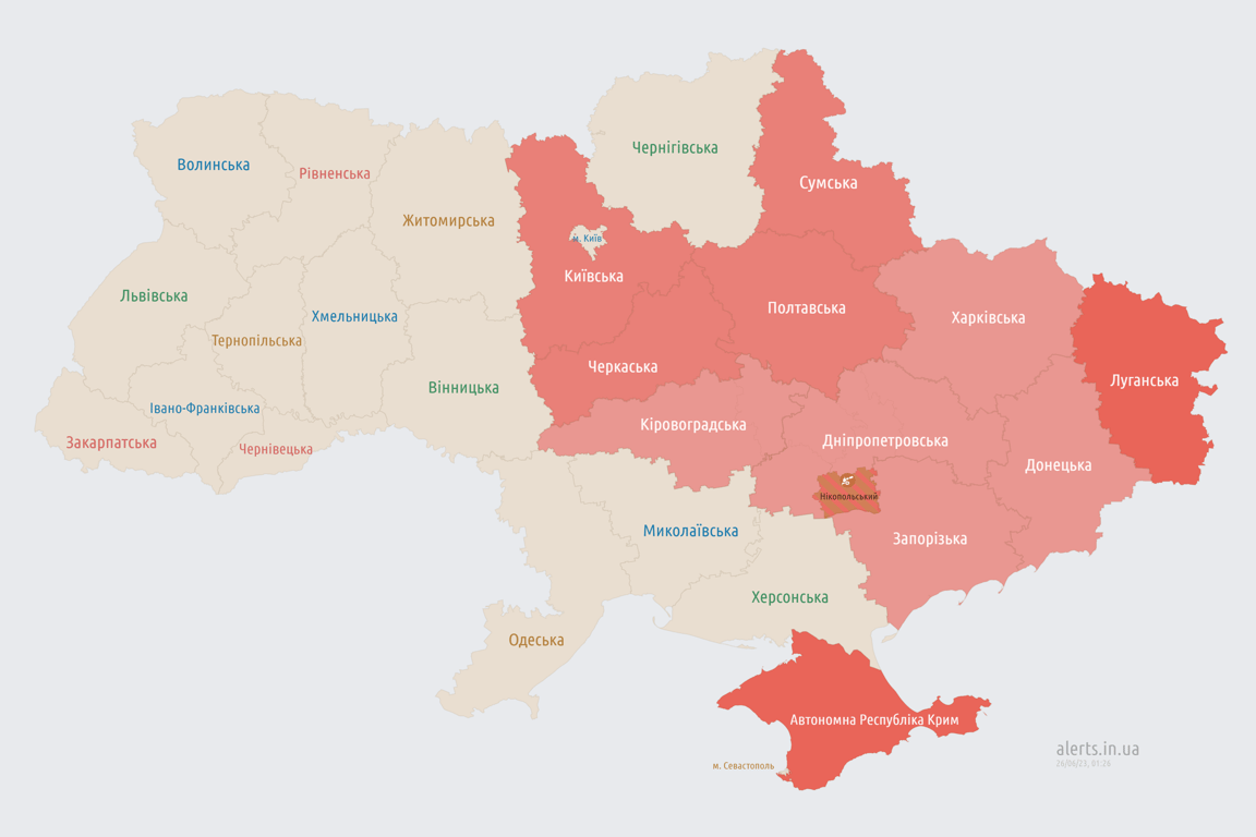 Вночі 26 червня прогриміли вибухи в Київській області. Також у більшості областей України зберігається повітряна тривога.