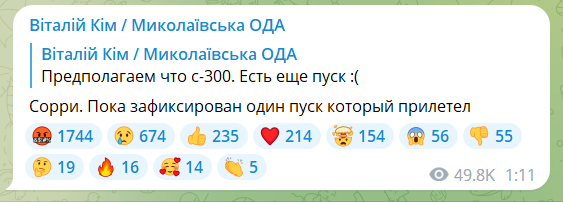 Оновлено 01:17. "Соррі. Поки що зафіксовано один пуск, який прилетів", — зазначив Кім.
