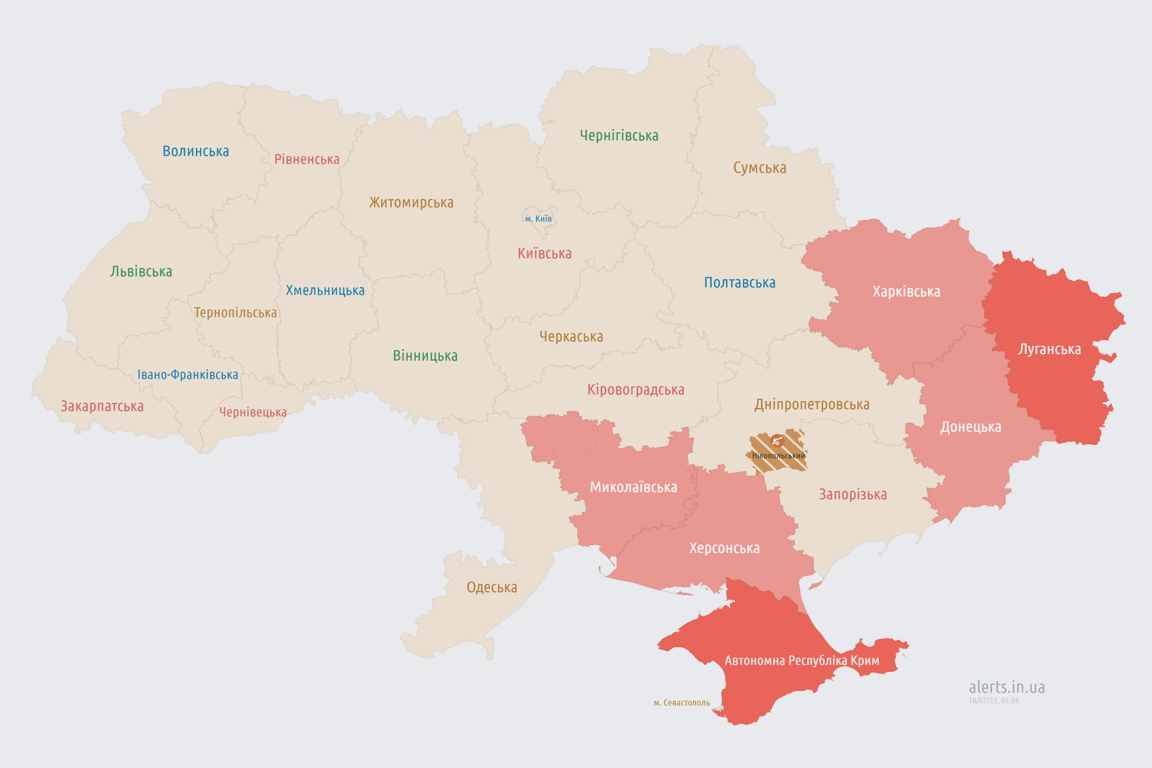 Оновлено 01:14. Наразі повітряна тривога спостерігається в Харківській, Донецькій, Миколаївській та Херсонській областях.