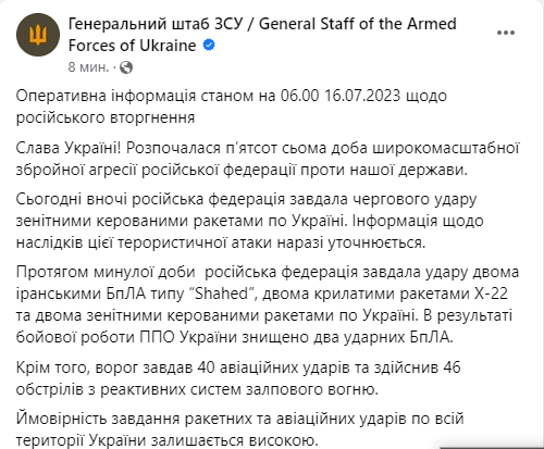 Звіт Генштабу ЗСУ на ранок 16 липня