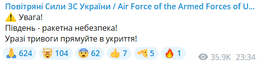 Оновлено 23:38. В Напрямку Одеської області ворог здійснив пуск ракет. Також Повітряні сили повідомляють про ракетну небезпеку для Півдня.