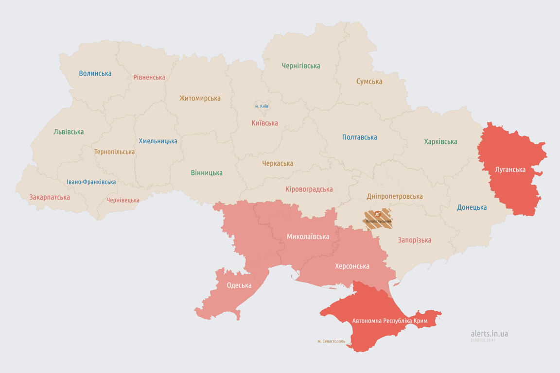Оновлено 23:41. Також, крім Одеської, повітряна тривога оголошена в Миколаївській та Херсонській областях.