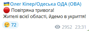 Очільник Одеської ОВА Олег Кіпер закликає не нехтувати безпекою та йти в укриття.