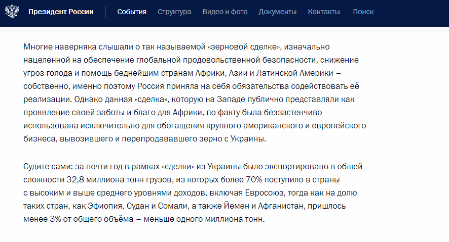У статті російського президента йдеться, що минулого року Росія нібито зобов'язалася сприяти реалізації Чорноморської зернової ініціативи, оскільки вона від початку була націлена на забезпечення глобальної продовольчої безпеки, зниження загроз голоду і допомогу найбіднішим країнам Африки, Азії та Латинської Америки.