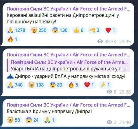 Крім того, захисники повідомляють, що російські загарбники запустили в напрямку Дніпра балістику з тимчасово окупованого українського Криму.