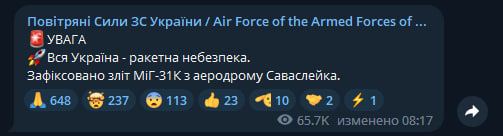 Повітряну тривогу оголосили через зліт в РФ винищувача МіГ-31К з аеродрому Саваслейка.
