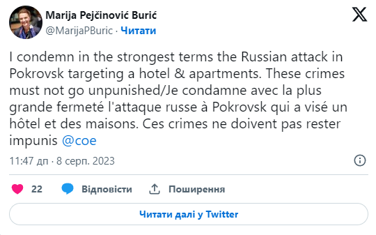Генеральний секретар Ради Європи Марія Пейчинович-Бурич засудила ракетний удар Росії по українському Покровську 7 серпня.